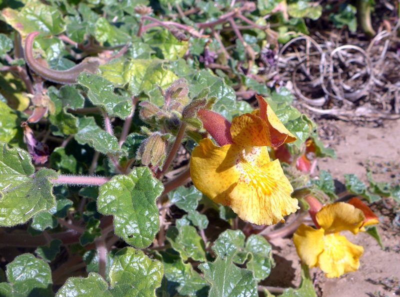Fig. 1. Proboscidea althaeifolia, desert unicorn-plant, devil's claw, in bloom and fruit at the parking area for Canyon 41, on 18 November 2018. Photo by Tom Chester. Click on the photo for a larger version.