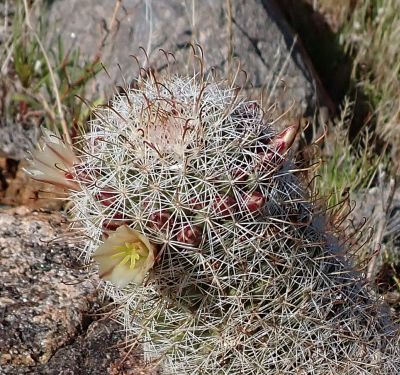 Although we have had small numbers of widely-scattered plants in bloom for a month or two, those plants are rarities that came from the light and variable rainfall on 26 September 2019. We're now seeing the usual perennial plants that begin to bloom in most Januaries, such as Prunus fremontii in Culp Valley at 3000 feet elevation and Mammillaria dioica on the desert floor near 1000 feet elevation; see Fig. 1.