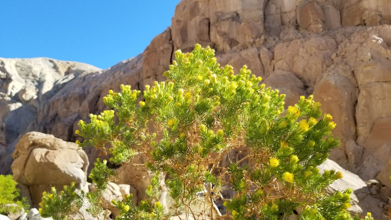 3 March 2022. Sanjiv Nanda reports that he and Alan Parks found at least two dozen, perhaps three dozen, plants of pygmy cedar, Peucephyllum schottii, in full bloom, along with dozens of desert tobacco, Nicotiana obtusifolia, in the slot canyon that is north of the end of the middle fork of Palm Wash.
