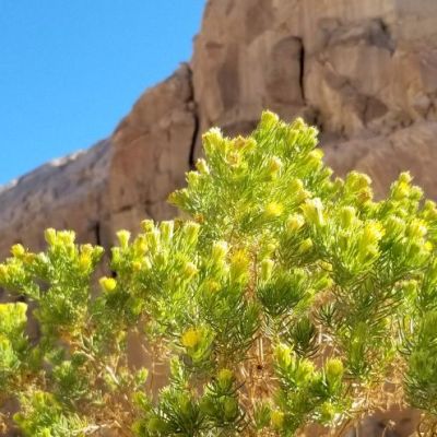 Sanjiv Nanda reports that he and Alan Parks found at least two dozen, perhaps three dozen, plants of pygmy cedar, Peucephyllum schottii, in full bloom, along with dozens of desert tobacco, Nicotiana obtusifolia, in the slot canyon that is north of the end of the middle fork of Palm Wash on 2 March 2022.