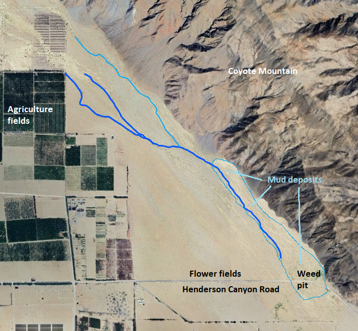 Fig. 1. The main drainage channels of Coyote Creek on the southwest side of Coyote Mountain near the Henderson Canyon Road Flower Fields. The main channels in 2025 are traced with heavy blue lines, with a secondary channel in the northern half of the pix traced with a lighter blue line. There are many braided channels in the area in the southern part of the map outlined in very light blue, marked as "Mud deposits", with only the main channel in December 2025 traced with the heavy blue line. Near the road, at the south end of the mud deposits, is a "weed pit" composed mostly of non-native plants.