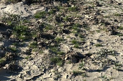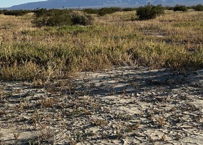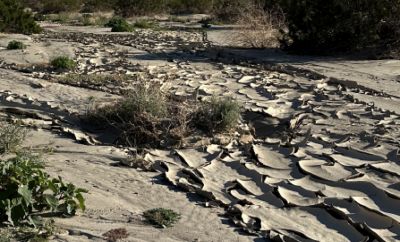 Top right: Photograph taken on 5 December 2025 of an area below Zeroth Crossing (where Coyote Creek crosses Coyote Canyon Road 0.6 miles north of the end of the pavement of Di Giorgio Road) where the sand / mud spread across a large area, just north of orchards.