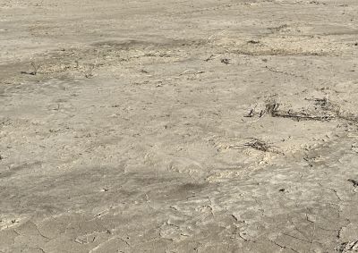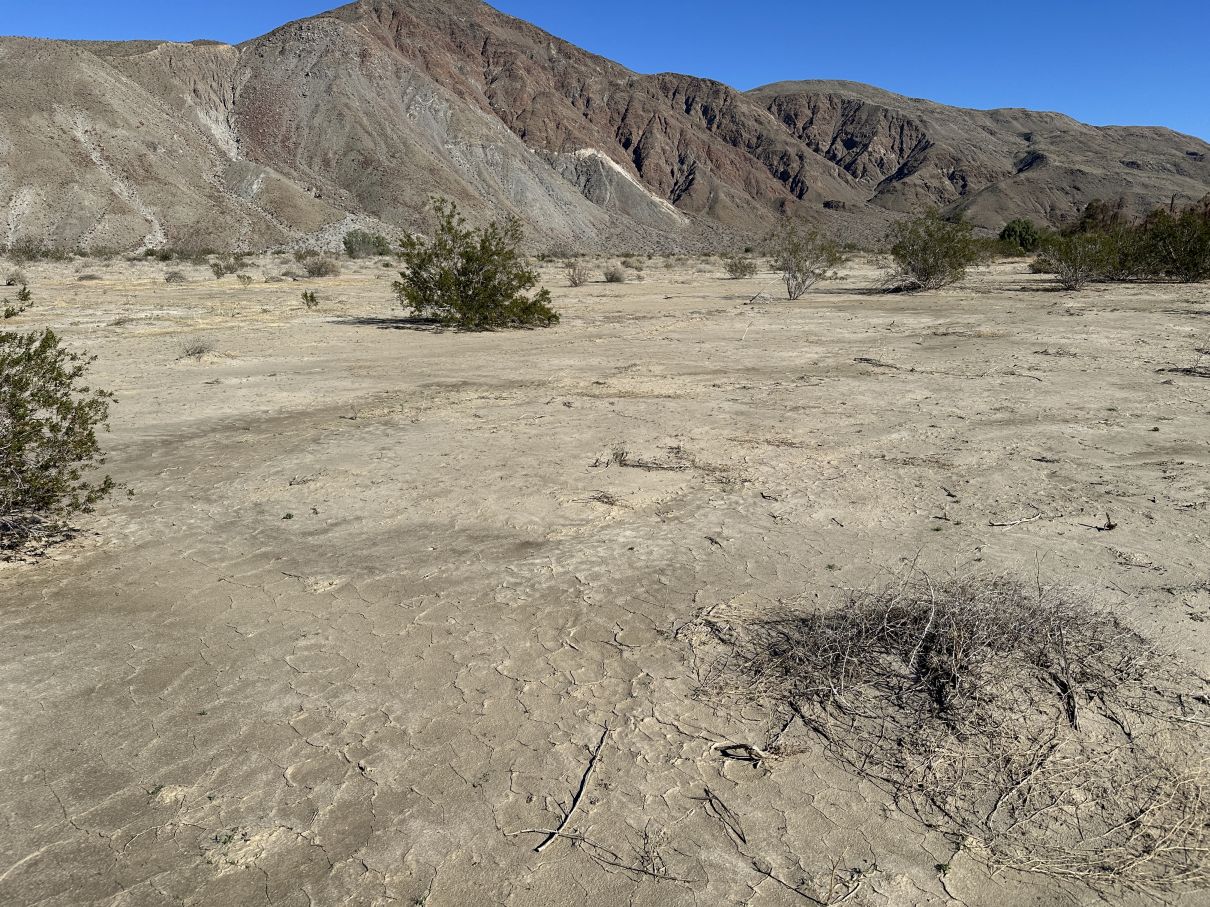 The southern drainage seen in Fig. 3 is especially easy to trace, since it is typically 10 to 20 feet wide, and is incised over nearly its entire length by two to three feet. When we traversed it in December 2025, it had ~10 foot wide dried mud in the channel over most of its length, and had unfortunately been driven on by an unauthorized vehicle; see one example.