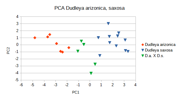 PCA Analysis for a Hybrid Population of D. arizonica and D. saxosa This page reports the details for the Principal Component Analysis whose results are given in this page: A Hybrid Population of D. arizonica and D. saxosa. See that page for an introduction to this analysis.