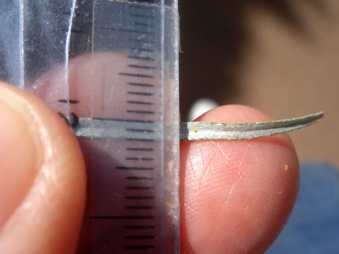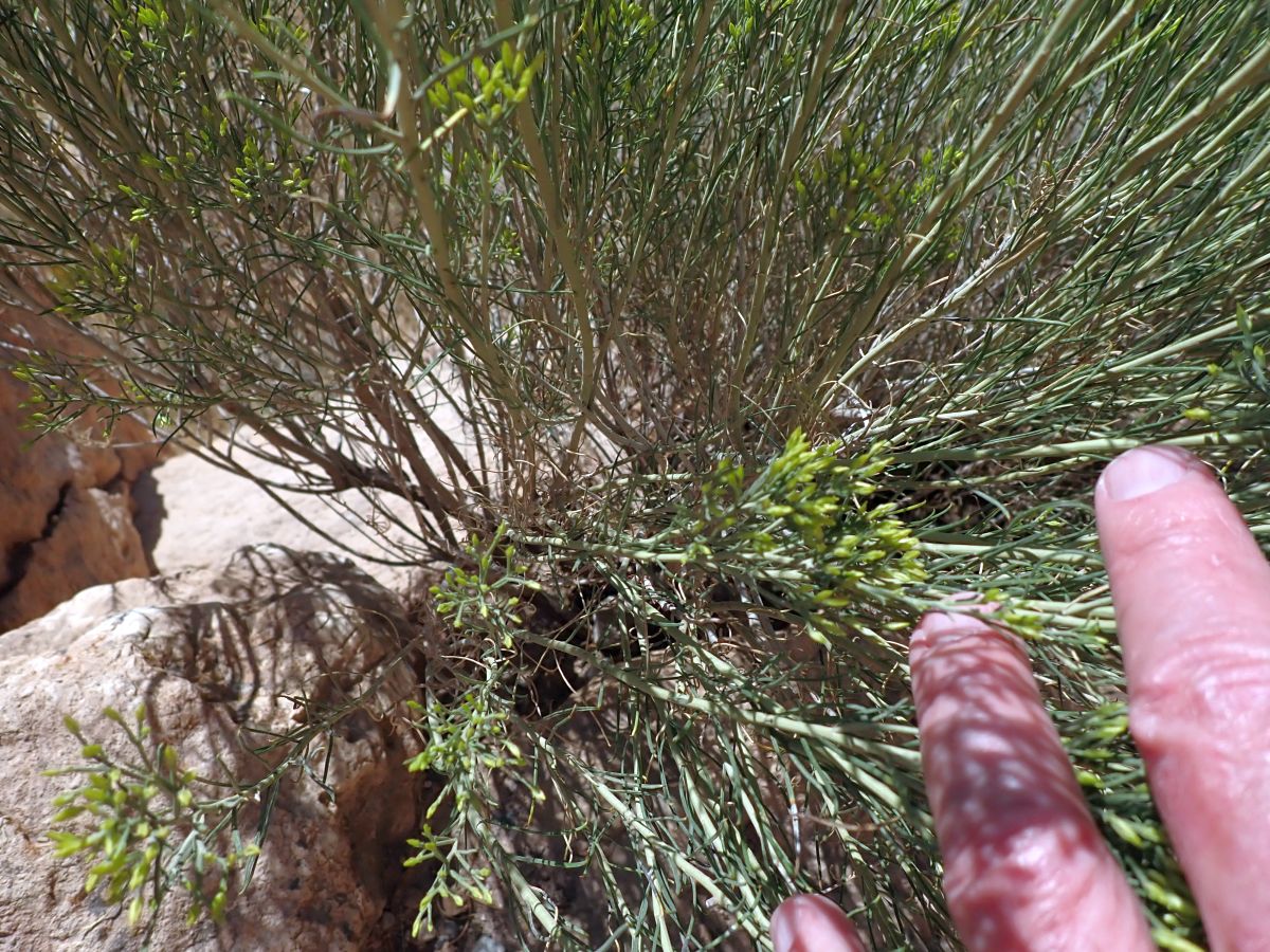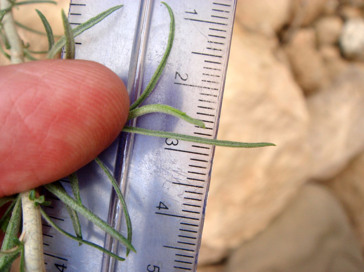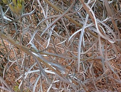 Up close, it is usually easy to confirm the identification from the difference in the width and color of the leaves. Var. graveolens has 1 to 2 mm wide silvery leaves. Var. oreophila has 0.5 to 1.0 mm wide narrow green leaves. Those narrow leaves gave it the common name of threadleaf rabbitbrush. See Figs. 3 and 4.