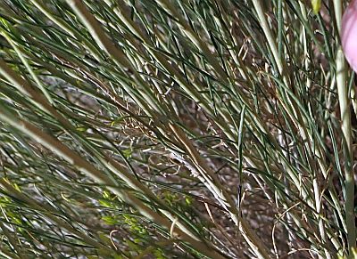 The two varieties in the GC Village area can easily be separated from a distance by the color of their leaves and stems - var. graveolens, gray rabbitbrush, has grayish / whitish / silvery leaves and whitish stems, whereas var. oreophila, threadleaf common rabbitbrush, has greenish leaves and whitish/greenish stems; see Figs. 1 and 2.