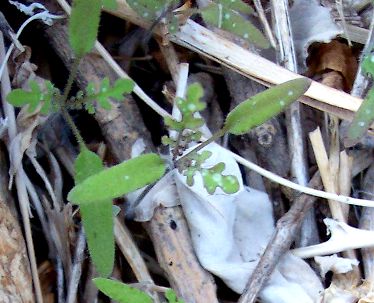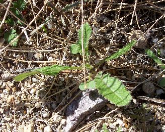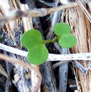 Tentative identifications are given for the seedlings in each column. I'm fairly confident of the determination of Phacelia distans, since I photographed it at known locations of this species on the Borrego Palm Canyon Trail. Also, Erodium cicutarium and Brassica tournefortii have distinctive cotyledons and leaves. The other tentative identifications are less certain.