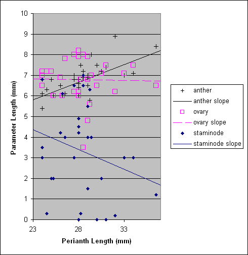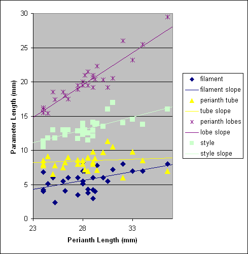 As expected, most of the floral parts have a positive slope; i.e., they do indeed get larger as the perianth gets larger. The strongest effect (the steepest line going up to the right) is for the perianth lobes. This of course isn't surprising since the perianth length is the sum of the length of the perianth tube and the perianth lobes.