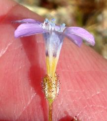 If you observe no hairs at all, or hairs that do not appear cobwebby, then look at the flower from the side to determine whether the stamens and style are long-exserted or not, as in the picture to the right of G. caruifolia. (Long-exserted means those parts stick out well past the end of the flower lobes. Compare the stamens in the picture to the right with the short-exserted stamens and style in the pix of G. stellata immediately below.). If the stamens and style are long-exserted, you've identified G. caruifolia.