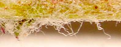 The first step is to observe the lower portion of the main stem, to look for cobwebby hairs on the stem, as in the picture to the right. You're looking for faint strands of hair that overlap, much like the wispy cobwebs in a basement where people haven't been for a while, and not like the obvious cobwebs in Halloween decorations.