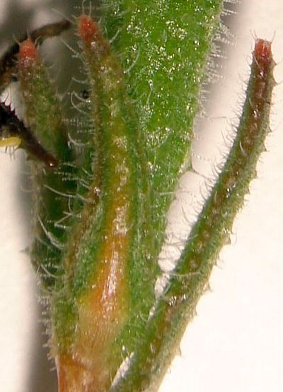 Fig. 2. Photo showing the difference between inflorescence bracts and flower bracts, and the "special case" of the first flower / fruit. The lowermost fruit in this pix is a "special" fruit because it has no flower bracts, and because it can curve up to 45° at maturity for M. montana, and up to a full 180° at maturity for M. albicaulis. See photo of a 180° curved fruit of M. albicaulis from Canyon 41.