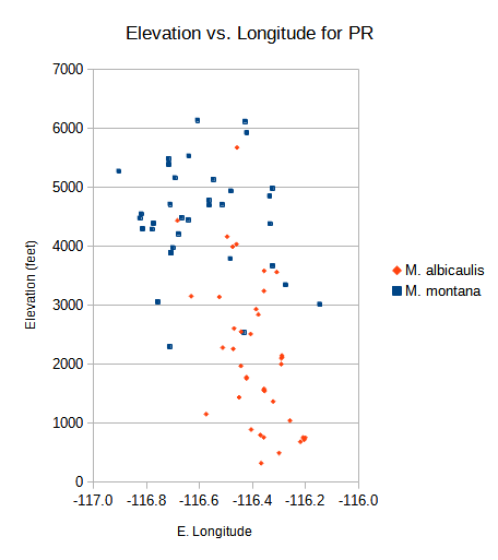 These plots also show that some vouchers are highly likely to be misdetermined, or have inaccurate georeferenced positions. Some vouchers of M. albicaulis are located above 6000 feet elevation in the midst of large numbers of M. montana, and some vouchers determined as M. montana are found at suspiciously low elevations in the midst of large numbers of M. albicaulis. This is not surprising at all, given the difficulties of properly determining some specimens, and accurately georeferencing sometimes-vague locations.