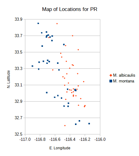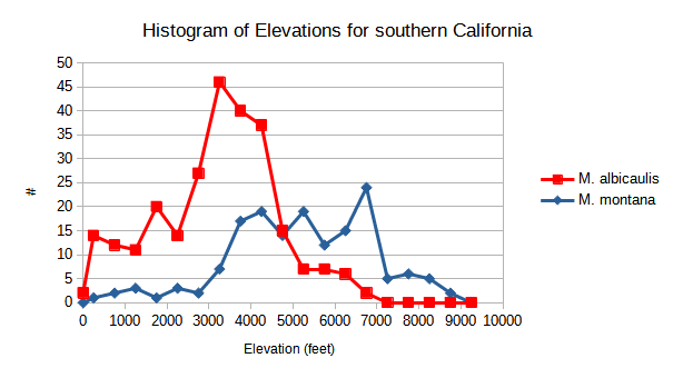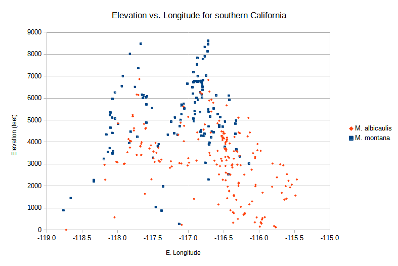 There are possibly other vouchers that should be re-checked, but none of them stand out as clearly as the three listed just above. In particular, the westernmost voucher determined as M. albicaulis, plotted at Warner Springs at (33.2842, -116.63113), and west of a voucher of M. montana, is a 1925 voucher from Jaeger which has a very uncertain location. ("Warner Springs" may just have been the closest named location.) Even if the location is actually at Warner Springs, that is a lower elevation location than the vouchers of M. montana to the east, so that voucher may well be correctly determined and georeferenced.