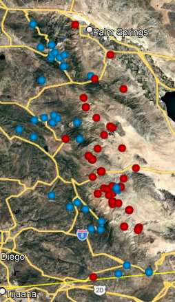 The following figures 6, 7 and 8 zoom in on the vouchers from the San Jacinto Mountains, the Peninsular Range, and Anza Borrego Desert State Park, which avoids combining the higher-elevation Mojave Desert and the lower-elevation Sonoran Desert. I will just call this area the PR for short.