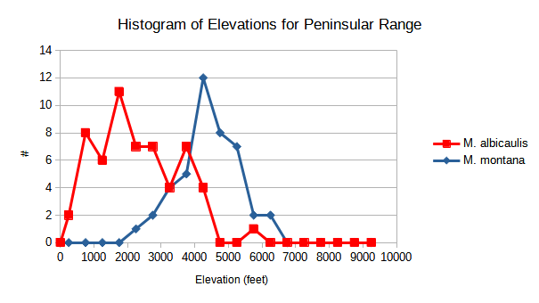 These plots show a cleaner elevation histogram for both species, with M. albicaulis found almost uniformly between 500 and 4000 feet elevation, and M. montana with a fairly sharp distributiom from 3000 to 5500 feet.