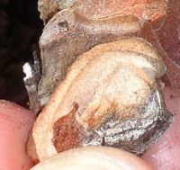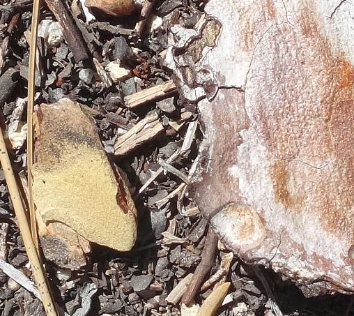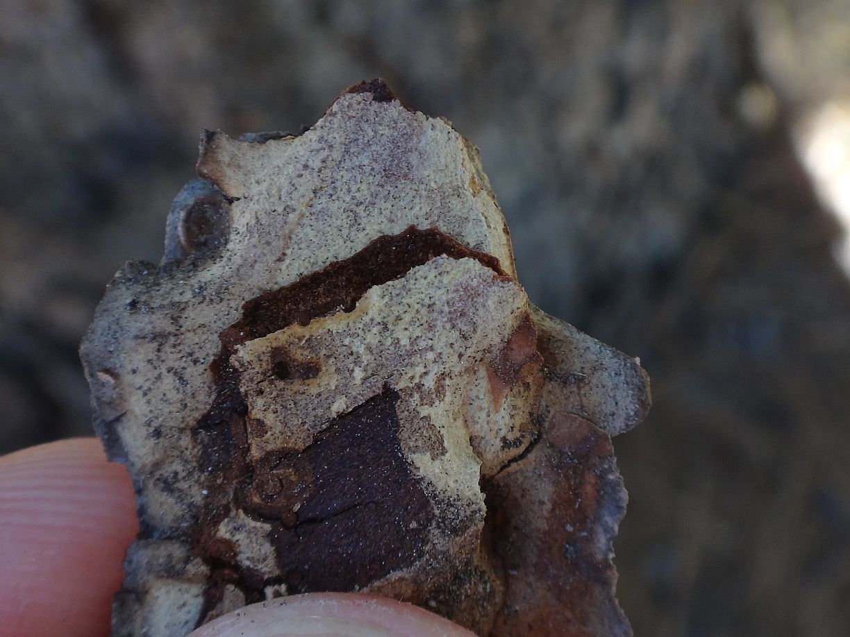 Pinus jeffreyi and P. ponderosa bark chip colorsFig. 1. The inside of bark chips from P. ponderosa (left; color yellow-brown) and P. jeffreyi (right; color red-brown). Click on the picture for a larger version.