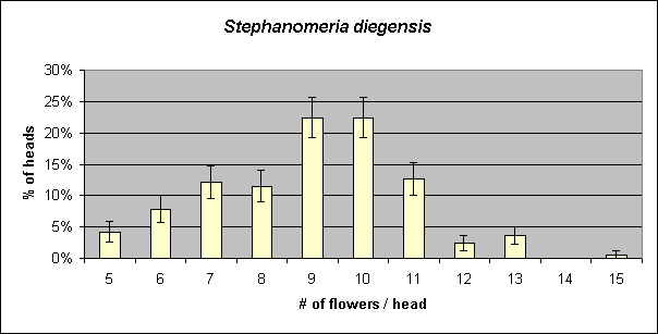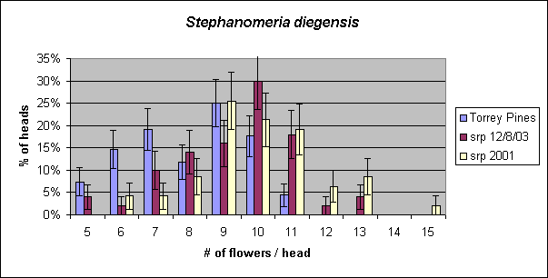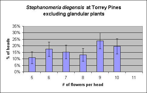 These histograms are identical to within the error bars, and both are consistent with a smooth, single-peaked curve within their error bars. It is also possible that the true histogram actually has two peaks, one close to 6-7 flowers per head and another close to 9-10 flowers per head. Such a distribution is also consistent with my histogram within the error bars. However, a distribution with two peaks is ruled out when the S. diegensis specimens from the Santa Rosa Plateau are included in a similar plot shown below.