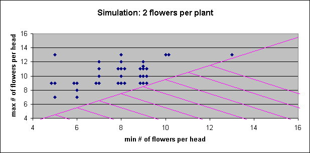To address this possibility, I simulated producing the above plot by chance. I used the population distribution for the number of flowers per head, and randomly drew samples from that histogram for each head for each simulated plant. I then analyzed the simulated plant for its minimum and maximum number of flowers per head over all the simulated heads.