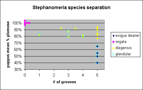 I have plotted this population from the SRP on top of the plot presented earlier which separates the three Stephanomeria species based on pappus plumosity and the number of grooves in the seeds: