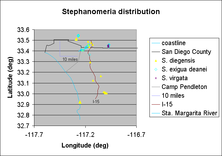Northwest San Diego County Area All the data points were collected by myself, except for two S. diegensis points that straddle I-15 near the middle of the plot; one from James Dillane for Daley Ranch, and one from Wayne Armstrong for the Merriam Mountains in the middle of the plot. The lowest latitude points are Torrey Pines State Reserve on the west and Blue Sky Ecological Reserve / Mt. Woodson on the east.