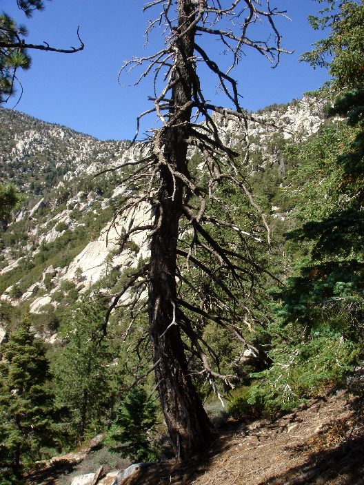 Often, the dead trees were the spitting images of the live trees, except they were without foliage, with each species have a characteristic form. Most of the dead trees seen on the Devils Slide Trail are white firs, Abies concolor, which usually have two distinctive characteristics: they have small branches relative to their trunk size (except for very large specimens); and they have dead branches that curl downward. Also, dead white firs sometimes retain dead mistletoe clumps, which is a dead giveaway since mistletoe is essentially found only on white firs at these elevations.