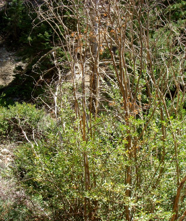 Scouler Willow, Salix scouleriana Unlike the other species, willows never really die, they just resprout. Scouler willow is present in four of the seven drainages on the Devils Slide Trail, as well as in a fifth moist area. The three higher elevation spots have plants with no dead stems, but the two lower elevation spots consist mostly of dead stems from a prior wetter time. The following picture shows one of the lower drainages: