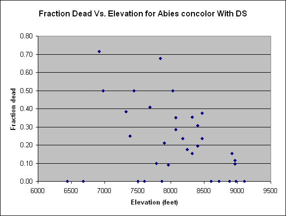 As also found on the Devils Slide Trail, the percent of dead Abies concolor is highest at its lower elevations. The following plot shows just the results of this survey, followed by a plot that includes the results from the Devils Slide Survey.