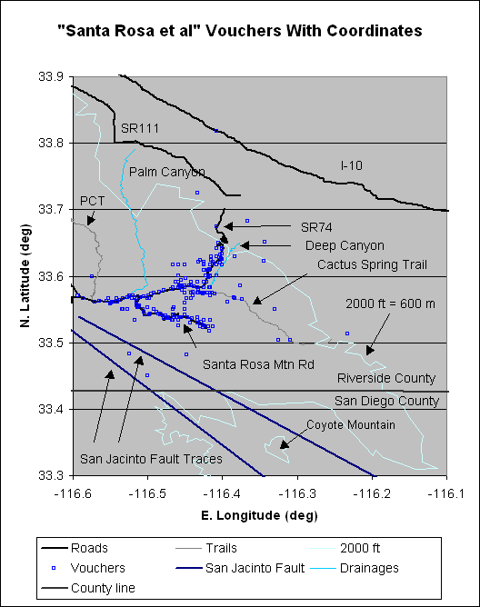 The georeferenced vouchers are, almost without exception, only taken along roads and trails. The vast majority of the area of the Santa Rosa Mountains is apparently unsampled.