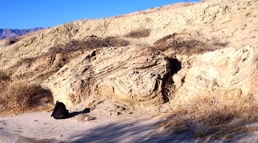According to the Fonts Point Field Trip guide in Remeika and Lindsay 1992, Geology of Anza-Borrego: Edge of Creation, p.109, the lower folded exposure is of the Mammoth Cove sandstone member of the Ocotillo Formation, with the contact paleomagnetically dated at about 700,0000 years in age. The upper flat exposure is of consolidated sandstones, red and greenish-colored mudstones and claystones of the Inspiration Wash member of the Ocotillo Formation, recently assigned a paleomagnetic date of less than 500,000 years of age