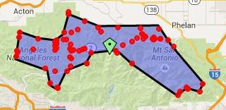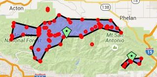 Right: the minimum area computation using (in this case) two polygons that enclose groups of points that are closely-spaced. Note that single points or very-closely-spaced points not near other voucher locations are ignored as contributing very little area. I've also minimized the area by using a more conservative polygon connecting the points at lower left in the map. The sum of the two calculated areas is 185 square miles.The area was computed using the Consortium / Berkeley Mapper polygon tool using the voucher map, and is also not precise. As a result, numbers have been rounded to the nearest five square miles. For comparison, the area of the entire San Gabriel Mountains, not including the Liebre Mountains north of SR14, is roughly 900 square miles.