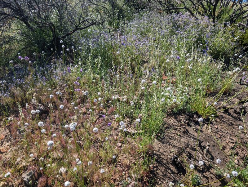 Burn area at mile 1.98 from the trailhead, showing mostly a large field of Gilia capitata, globe gilia. Pix by Tom Chester.![]()