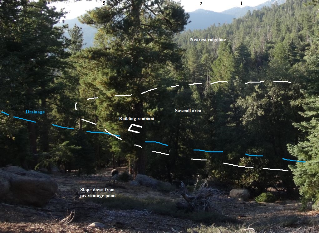 - The slope down from the vantage point to a drainage, with the sawmill site on the other side of the drainage.