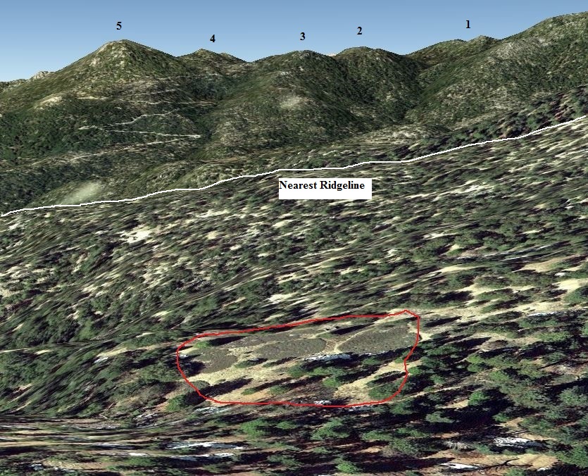 The following screenshot from Google Earth shows the mill site, outlined in red, now an unforested area dominated by mountain whitethorn, Ceanothus cordulatus, along with the horizon view with the horizon peaks numbered: