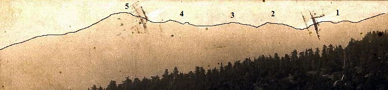 The nearest ridgeline is much lower relative to the horizon peaks because the vantage point in Google Earth had to be above ground level to show the unforested area that was the mill site. The five labeled peaks in the horizon view match up perfectly with the five peaks seen in the old picture. The following gives an enhanced version of that horizon view: