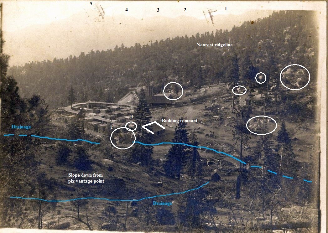 Tom was able to use the nearest ridgeline and horizon view of that picture to pin down the location, with the aid of Google Earth as the Sawmill Flat on the Sawmill Trail / Road, and the probable vantage point. This location in Dark Canyon is the site of the San Jacinto Lumber and Box Company site operated from 1908 to 1922 by Hiram Roach (Robinson and Risher, p. 97).