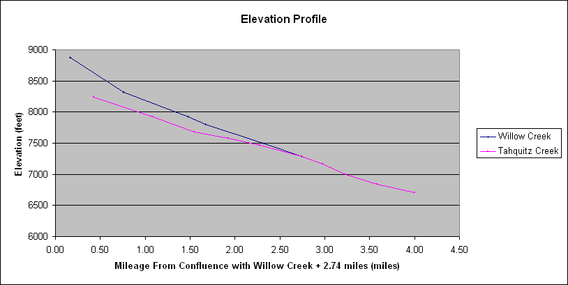 The study area was traversed entirely on foot. The survey was conducted from the best available vantage point for any given location. Every attempt was made to search from within the stream bed whenever possible, while some surveys had to be conducted from the stream bank. On occasion a section of creek had to be bypassed because of impenetrable willow thickets, impassable waterfalls and rock formations, or large pools of water. No attempt was made to quantify this distance, but we strongly believe it is negligible at less than x% of the study area.