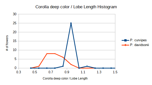 Fig. 4. Ratio of the length of the corolla deep color at the tip of the corolla, to the length of the corolla lobes, for the plants at the type localities for P. curvipes and P. davidsonii.