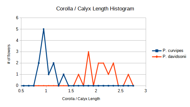 Fig. 3. Ratio of Corolla to Calyx for the plants at the type localities for P. curvipes and P. davidsonii.