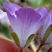 Fortunately, as mentioned in Fig. 1, there are two discriminants easily visible in many pix that separate the species well. First, the flowers of P. curvipes barely stick out of the calyx, having ratios of 0.9 to 1.3 in my preliminary analysis of iNat photos from its type locality near Lake Tahoe. In contrast, the flowers of P. davidsonii stick way out of the calyx, with preliminary ratios of 1.6 to 2.7 from its type locality in Kern County.
