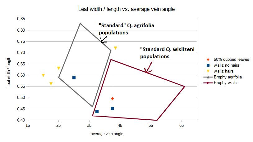 Specimen Name and iNat obs link Width / length lateral vein angle min lateral vein angle max average lateral vein angle upper leaf color lower leaf color upper leaf hairy lower leaf hairy Wisliz 1 0.72 37 50 43.5 Bright / yellow / green Yellow-green no to yes no "hybrid" 0.50 37 48 42.5 dark green Yellow-green no to yes no to yes Wisliz 3 0.44 35 40 37.5 Bright / yellow / green to dark green Yellow-green to green no no Wisliz 4 0.45 40 45 42.5 Bright / yellow / green to dark green Yellow-green no no Wisliz 5 0.59 25 35 30 Light green to dark green Yellow-green no no Wisliz 7 0.56 20 25 22.5 Light green to dark green Yellow-green no to yes no Wisliz 8 0.63 20 30 25 gray to dark green Yellow-green yes yes Wisliz 9 0.60 5 35 20 Light green to dark green Yellow-green to green no no to yes Brophy and Parnell plotted the leaf width to length ratio vs. the average angle of the lateral veins, which showed a good separation of the species for pure stands of each species. They found that populations with suspected hybrids did not fall within the pure species delinations.