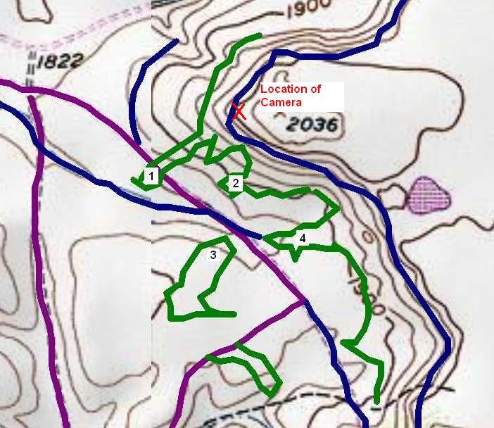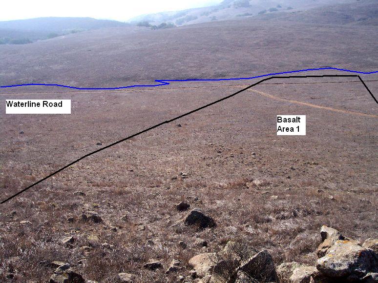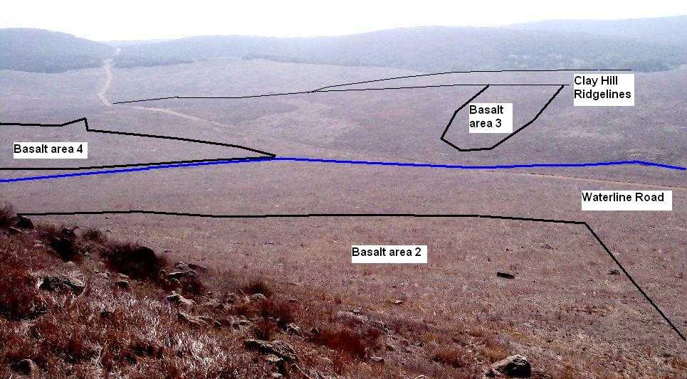 The basalt areas are approximately outlined in black in the following photographs, with numbers corresponding to the ones on the map above. I.e., we have not used GPS coordinates of the mapped basalt and georeferenced the pictures; Tom simply estimated by eye, using the mapped contours and landmarks in the pictures, to draw the contours by hand. The drainage is drawn in blue.