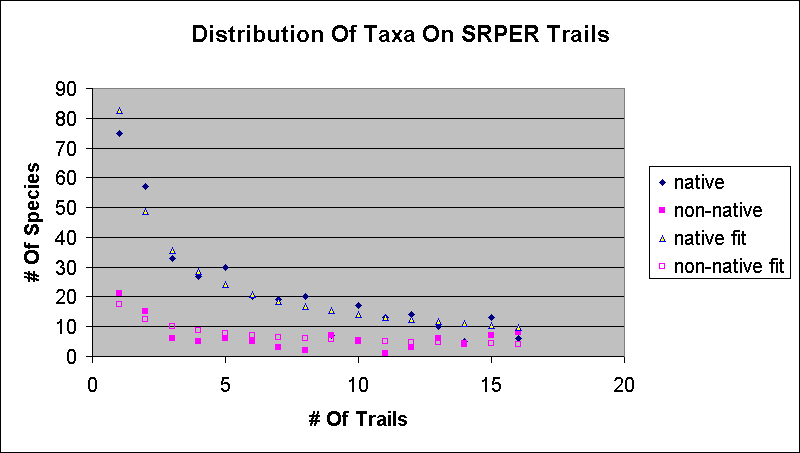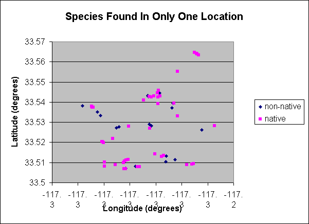 Map of the taxa found in only a single location (black cross: native; pink triangle: non-native):
