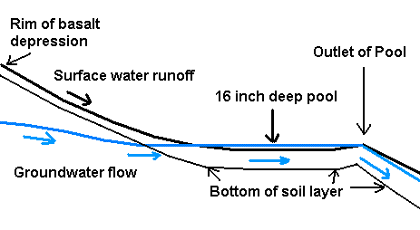How the water creates the pool in the first place has changed as the basalt was weathered. Initially, rainfall directly ran off the basalt surface to the bottom of these depressions, and any rainfall at all formed a pool (puddle at that time) with further runoff flowing out of the pool. As the basalt weathered to soil, the first rainfall no longer directly ran off, but was captured by the soil. Only when the soil becomes too saturated to hold more water can further rainfall run off to the bottom of the depression.