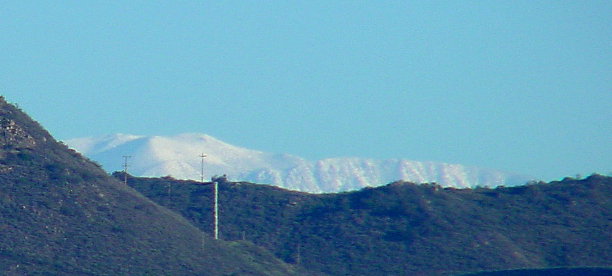 This picture was taken by Bob Gonsett on 12/18/02 from his house near the corner of Alta Vista Drive and Winterwarm Road. It shows San Gorgonio Peak and its ridgeline extending east-southeast. The much-closer ridge on the left is the south-southeast ridge of Red Mountain, with the pressure-relief pipe of the San Diego Aqueduct near its end. Behind the Aqueduct is the ridgeline extending east from Red Mountain.