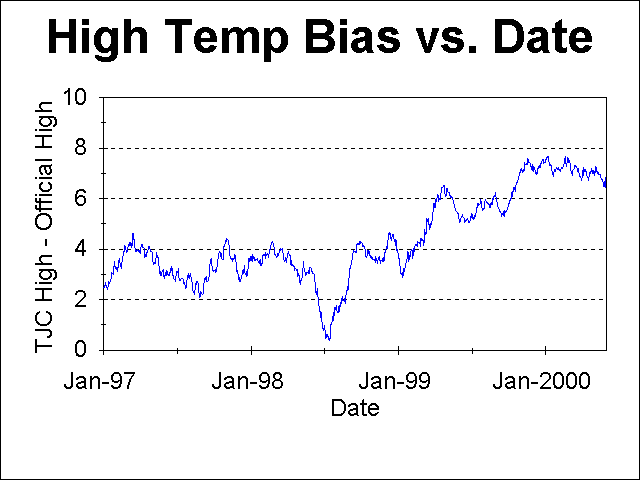 Before March 1999 the bias is consistent with zero. After March 1999 the bias is 1.7-3.8° until the eucalyptus trees were cut down in October 1999, making Mox's high temperatures significantly higher. These data thus also imply that the reported official Fallbrook high temperature has gotten cooler by about 2.8°.
