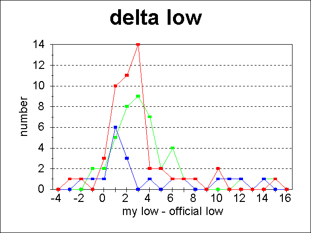 My "low temperature thermometer" is located in a natural area fairly close to my house and close to a large Canary Island Pine, which may produce a slight high bias for the low temperatures. I don't believe the magnitude of this effect is large, but I'll place another high-low thermometer in a more open area sometime to check it.