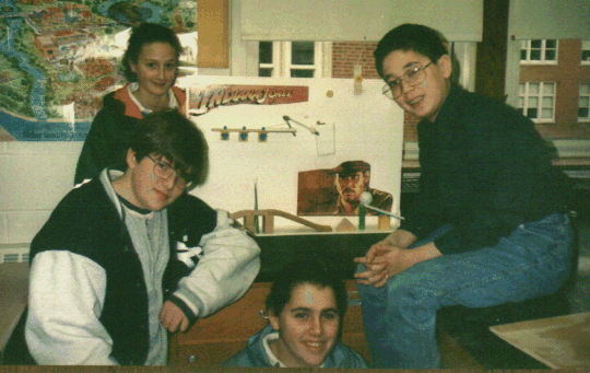 Indiana jumped onto the lever wondering what its purpose was. The force of the moving mining cart made the lever tilt away from Indy. He shot up into the air, out of the mining cart because there was a huge boulder on the other side of the lever and his force was not great enough to withstand the enormous force of the boulder. Amazingly there was an old pulley system that used to transport these huge boulders. As Indy grabbed on to it, it started to pull him.