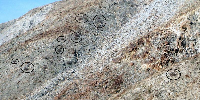 We've circled additional specimens in the following more close-up view, and often the circles in the previous photographs turned out to contain several elephant trees. There are probably additional specimens in this picture, but it is difficult to be sure from this photograph alone.