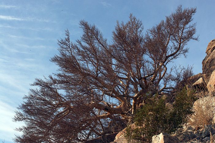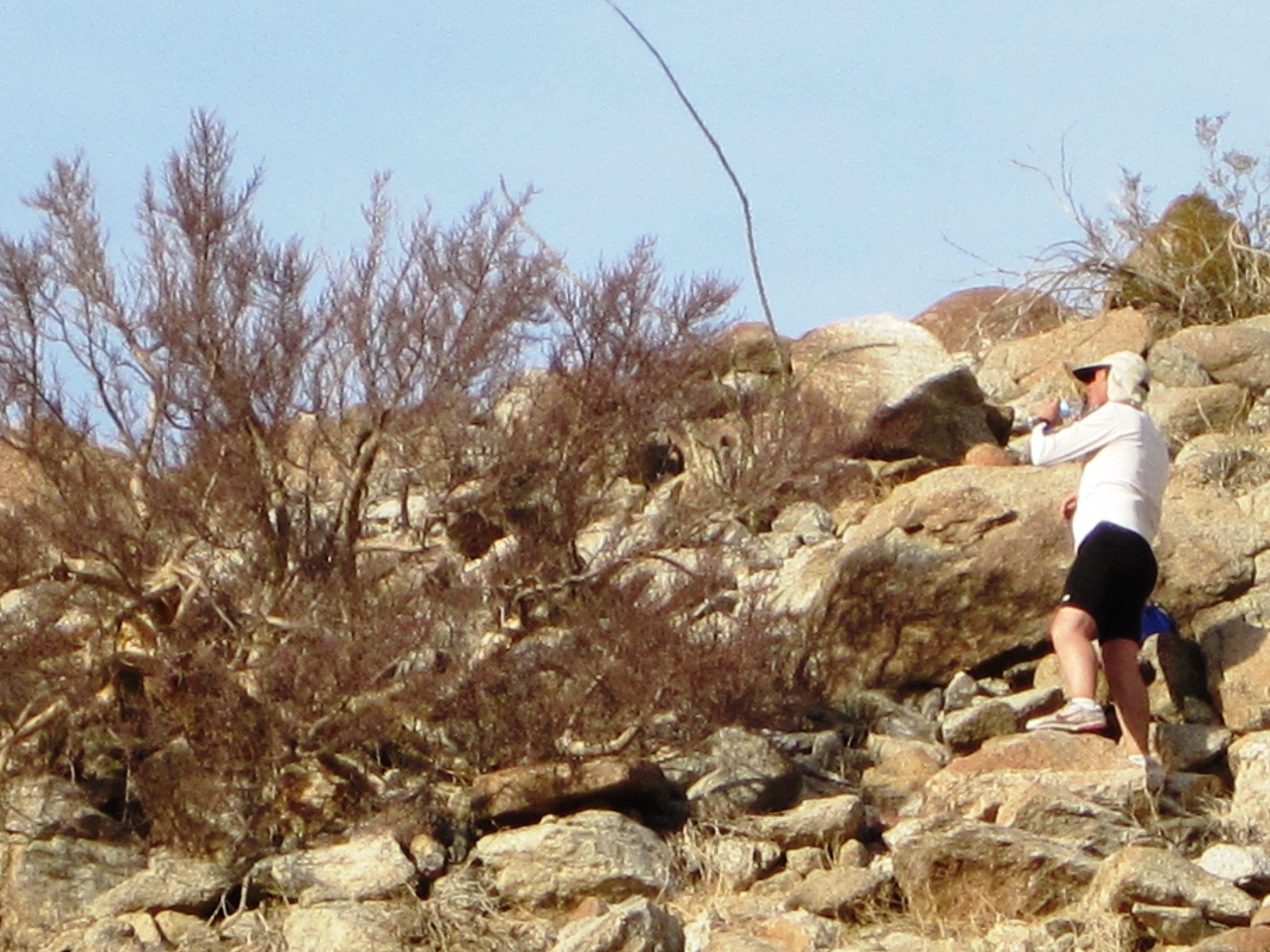 © Tom ChesterNote that not every dark spot seen in the previous photograph turns out to be an elephant tree on closer inspection. Boulders often have a very similar appearance, and both creosote and ocotillos can produce similar dark blotches. In fact, we found these plants on our very first survey, but thought that they might be Peucephyllum schottii, desert pine, aka desert fir and pygmy cedar, which grows in similar habitats and looks similar from a distance. Peucephyllum schottii does grow in this area, in the alluvial fan of the main drainage below Villager Peak (below the merger of drainages 1 and 2).