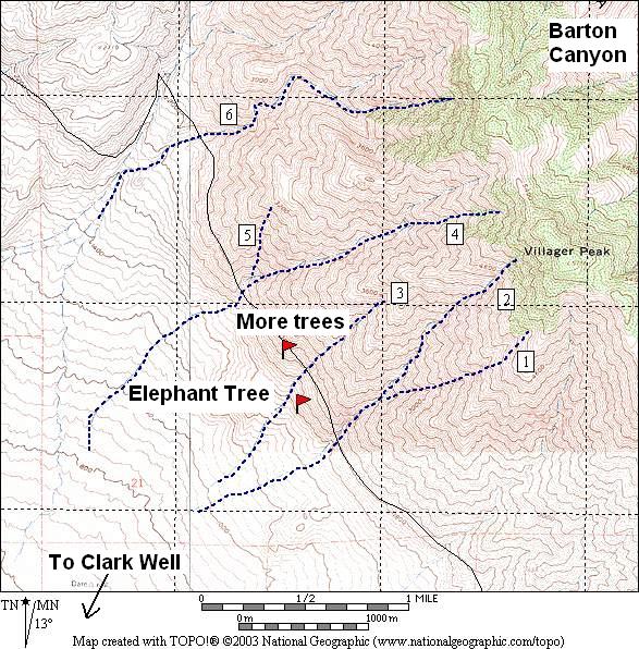 The elephant trees were indeed very close to the line from Clark Well toward Barton Canyon.